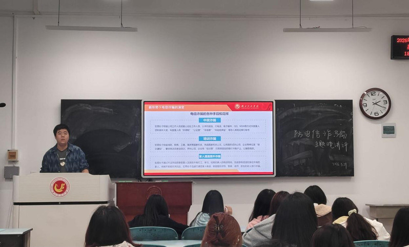 为切实筑牢校园安全防线,有效提升学生识诈、防诈、反诈能力,守护学生财产安全,3月29日,ok138cn太阳集团529利用晚讲评时间为全体学生开展了防范电信诈骗专题教育,通过讲解防诈知识、观看反诈视频、小组案例讨论、集中反诈测试等方式,推动反诈意识与防范能力同步提升。